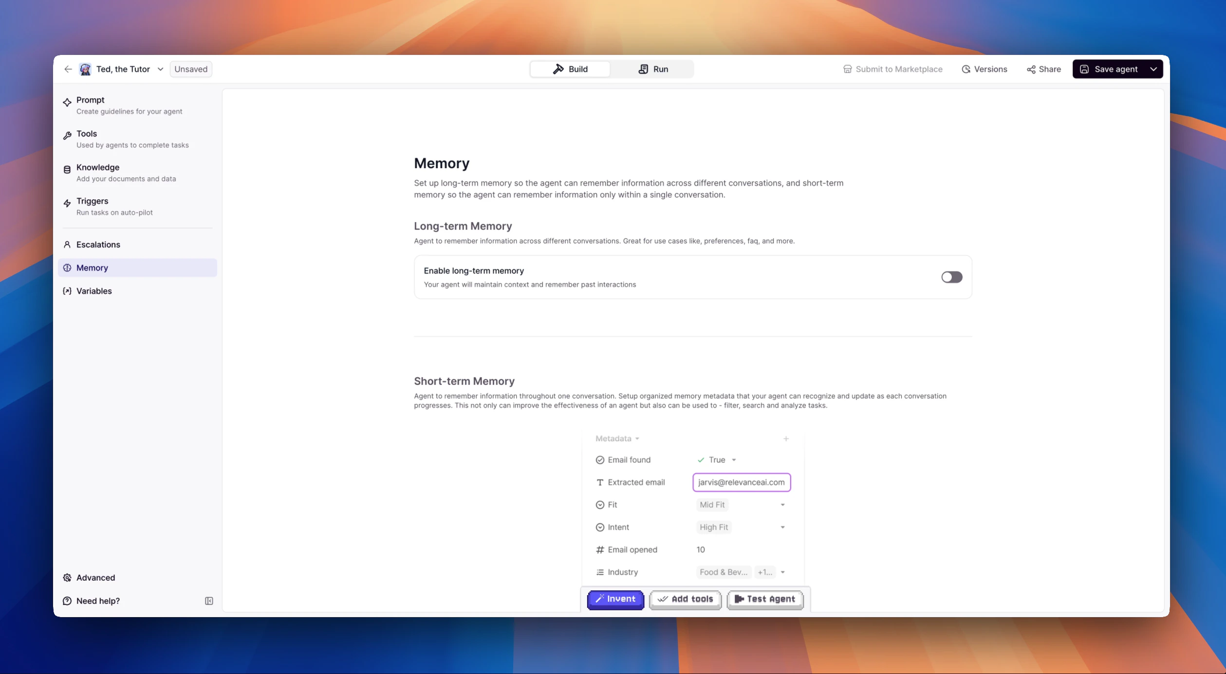 Relevance AI offers two approaches for extracting memory metadata:Let Agent Decide